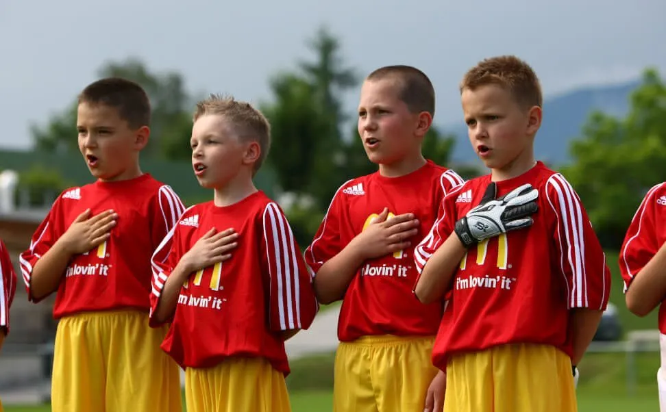 Эскортом футболистов на чемпионатах по футболу занимается «Макдоналдс», который отбирает детишек из местных школ, интернатов, детдомов. На поле матча в Волгограде действительно не вышел ребенок из интерната, вместо него на нем появился сын экономиста детского дома.