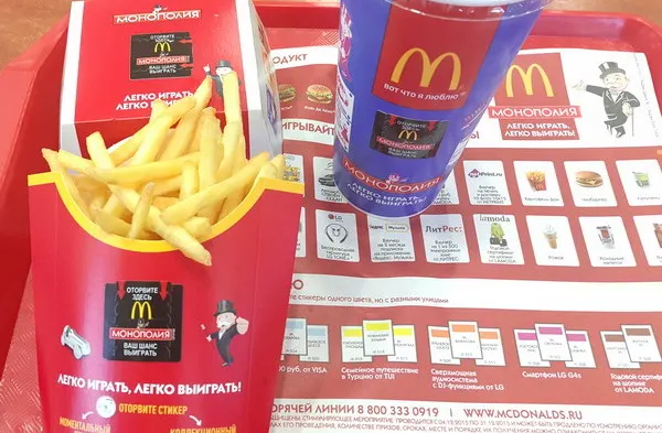 Акция «Монополия с McDonalds» проходит в самом популярном фатсфуде не первый год. Суть простая – нужно покупать линейку каких-нибудь продуктов, срывать стикеры и собирать их в коллекцию. Условно говоря, три разные улицы зеленого цвета дают право на получение автомобиля, желтого – двухкомнатной квартиры в Москве.