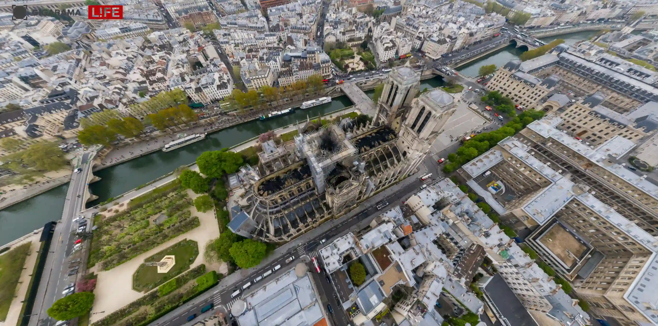 «Лайф» в проекте «Гигарама» показал, что осталось от одного из символов Парижа и Франции. Сгоревший Собор Парижской Богоматери и его окрестности сняли с воздуха.