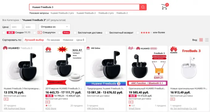 На Али устройство можно предзаказать и в Россию, но стоимость новинки серьёзно отличается. Мы нашли несколько лотов, прайс на FreeBuds 3 стартует с 12,9 тысяч рублей и может достигать почти 20 тысяч у некоторых продавцов.