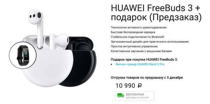 Предзаказать FreeBuds 3 можно прямо сейчас на сайте компании. Стоимость гарнитуры составит 10 990 рублей, но с промокодом AFB31000T ценник снизится до 9990 рублей, а в корзину упадёт трекер Band 3 Pro.