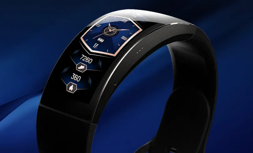 Устройство имеет необычный дизайн — благодаря гибкому AMOLED-дисплею диагональю 2,07 дюймов девайс полностью огибает запястье пользователя. «Прямую линию придумал человек, а изогнутую — Бог», — цитируют архитектора Гауди на странице продукта.