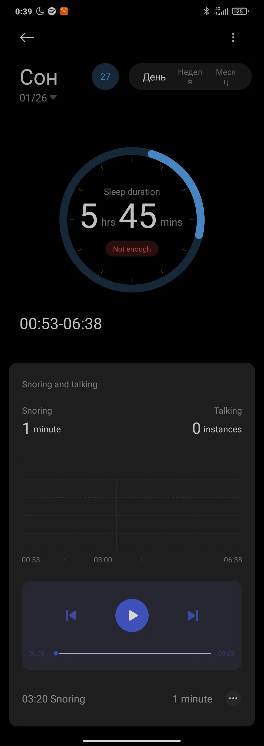 Но главное, что я выделяю в этом приложении — отслеживание сна. Если положить девайс под подушку или рядом с собой на ровную поверхность, то он будет считать время вашего сна, отслеживать его фазы и даже записывать ваши разговоры или храп! Последняя функция особенно интересна — благодаря ней я узнал, что храплю ночью. В принципе, я это подозревал.