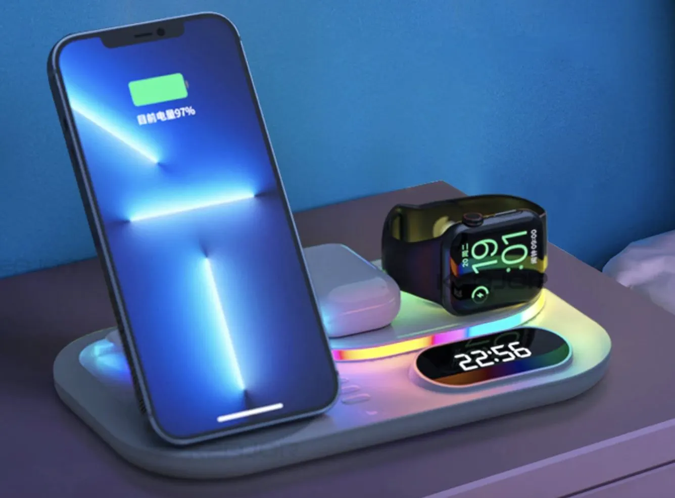 Щедрые китайцы встроили в аксессуар настраиваемую RGB-подсветку и небольшие часы — получилось стильное и полезное устройство, украшающее дом. Вот так выглядит зарядная станция на фотографиях из отзывов на Али: