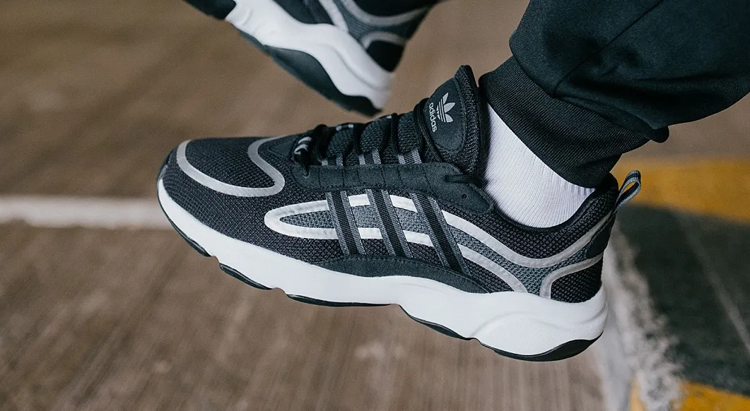 Вторые кроссовки – черно-серые adidas Originals Haiwee. Это обувь из линейки Originals, о чем свидетельствует фирменное лого с трилистником на язычке. Сетчатый верх соседствует с легкой ЭВА-межподошвой – получается отличный стритстайл-айтем на лето. Как раз для вечерних прогулок.