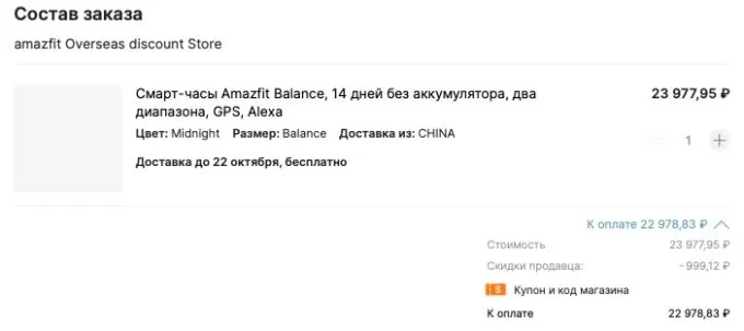 Сама компания оценила Amazfit Balance в 250 евро (~26 000 рублей), но сейчас на АлиЭкспресс горячую новинку можно урвать всего за 22 980 рублей с учётом купонов продавца.