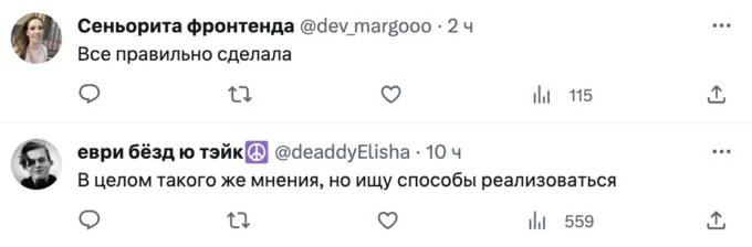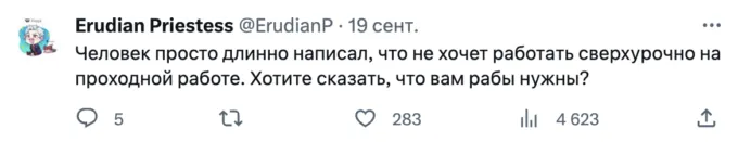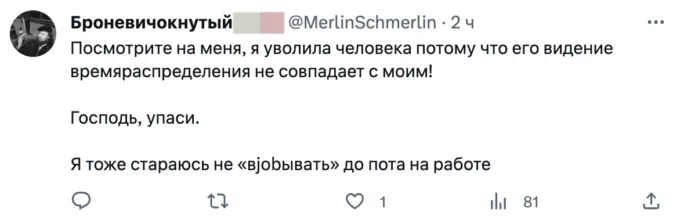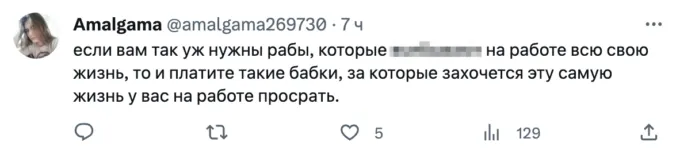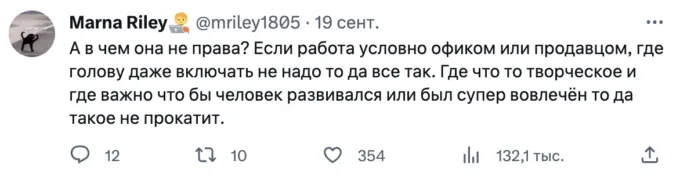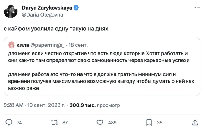 Все началось с поста от пользователя @paperrrings_, которая написала, что не понимает людей, которые определяют свою ценность через работу. «Для меня работа — это что-то, на что я должна тратить минимум сил и времени, получая максимально возможную выгоду, чтобы думать о ней, как можно реже», — заявила девушка (орфография исправлена — редакция).