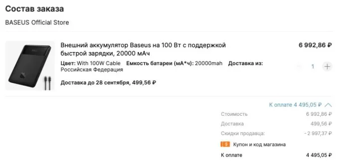 Прямо сейчас топовый аккумулятор Baseus Blade на 100 Вт можно урвать на AliExpress всего за 4495 рублей с учётом купонов магазина.