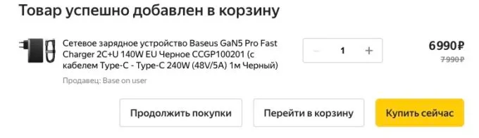 Обычно за такую зарядку просят почти 9 тысяч рублей, но сейчас на Яндекс Маркете топовую Baseus GaN5 Pro Fast Charger на 140 Вт отдают за 6990 рублей. Также не забывайте, что многие банки готовы отсыпать кэшбек за покупку на этой платформе.