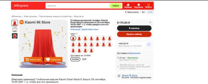 2. Цены пока завышенные. На момент написания заметки базовый стоит больше 8 тысяч рублей на Али, а Band 8 Active c уменьшенным дисплеем и 50 спортивными режимами — чуть больше 6 тысяч рублей. Они точно не стоят таких денег. Да, там есть ещё и купоны продавцов, которые будут активны с 26 сентября, но скидки по ним мизерные.