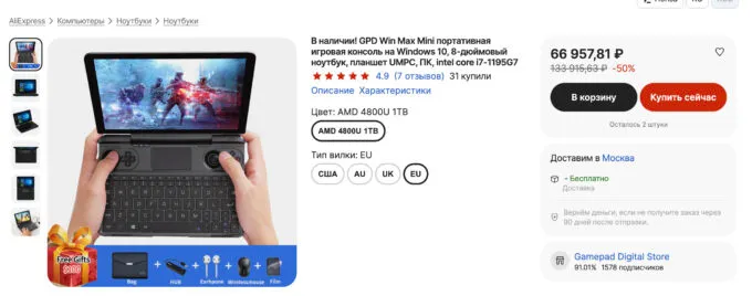 В то же время на Али продают один из предыдущих мини-ПК от GPD. Устройство под названием Win Max Mini имеет процессор Intel core i7-1195G7, 16 Гбайт ОЗУ, 1 Тбайт на SSD и стоит 67 тысяч рублей.