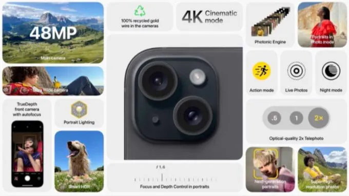 Основной модуль двойной камеры теперь имеет разрешение 48 мегапикселей. Телефоны могут снимать видео в режиме Cinematic Mode и разрешении 4К. Модели вышли с прошлогодним процессором A16 Bionic, а также получили увеличенный аккумулятор — его емкость не уточняется.