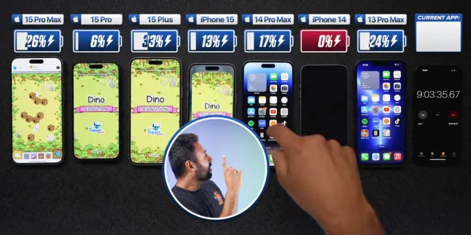 Блогер Mrwhosetheboss в очередной раз протестировал автономность всех актуальных смартфонов Apple. Энтузиаст зарядил все девайсы на 100%, а затем запускал на них различные приложения. Все устройства были в равных условиях.