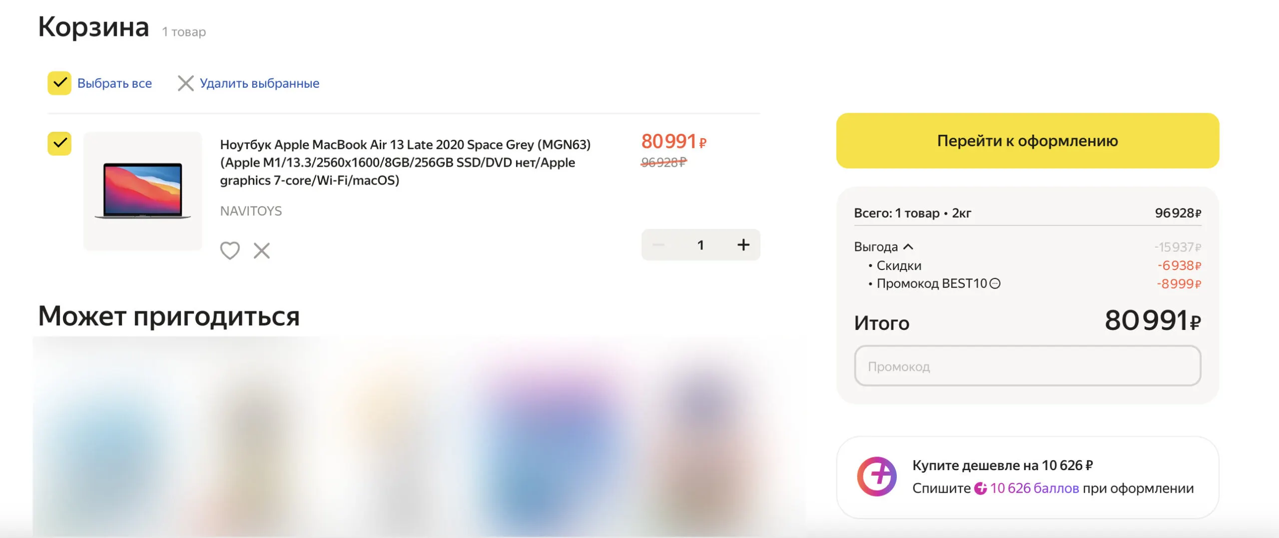 Сейчас MacBook Air можно купить со скидкой 10%. «Макбук» сам по себе подешевел до 90 тысяч рублей, но если ввести промокод BEST10, то можно забрать компьютер за 80 991 рубль. Акция с промокодом действует до 24 сентября.