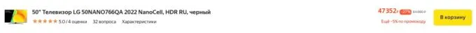 Сейчас на Яндекс Маркете крутой телик LG 50NANO766QA выставлен со скидкой всего за 47 352 рубля, но до 11 сентября можно скинуть 5% по промокоду BESTELECTRO. Плюс можно выбить дополнительный кэшбек в 10% в некоторых банках.
