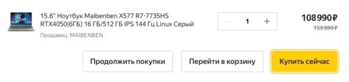Местные ритейлеры оценили Maibenben X577 в 160 тысяч рублей, но сейчас на Маркете его можно урвать всего за 108 990 рублей. Некоторые банки также готовы отсыпать жирный кэшбек за покупку на этой площадке.
