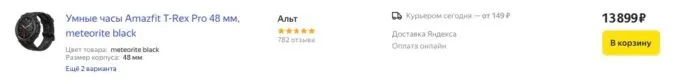 Обычно за Amazfit T-Rex Pro просят около 15 тысяч рублей, но сейчас на Яндекс Маркете часики в чёрном цвете можно купить за 13 899 рублей. Также не забывайте, что многие банки готовы отсыпать щедрый кэшбек за покупку на этой платформе.