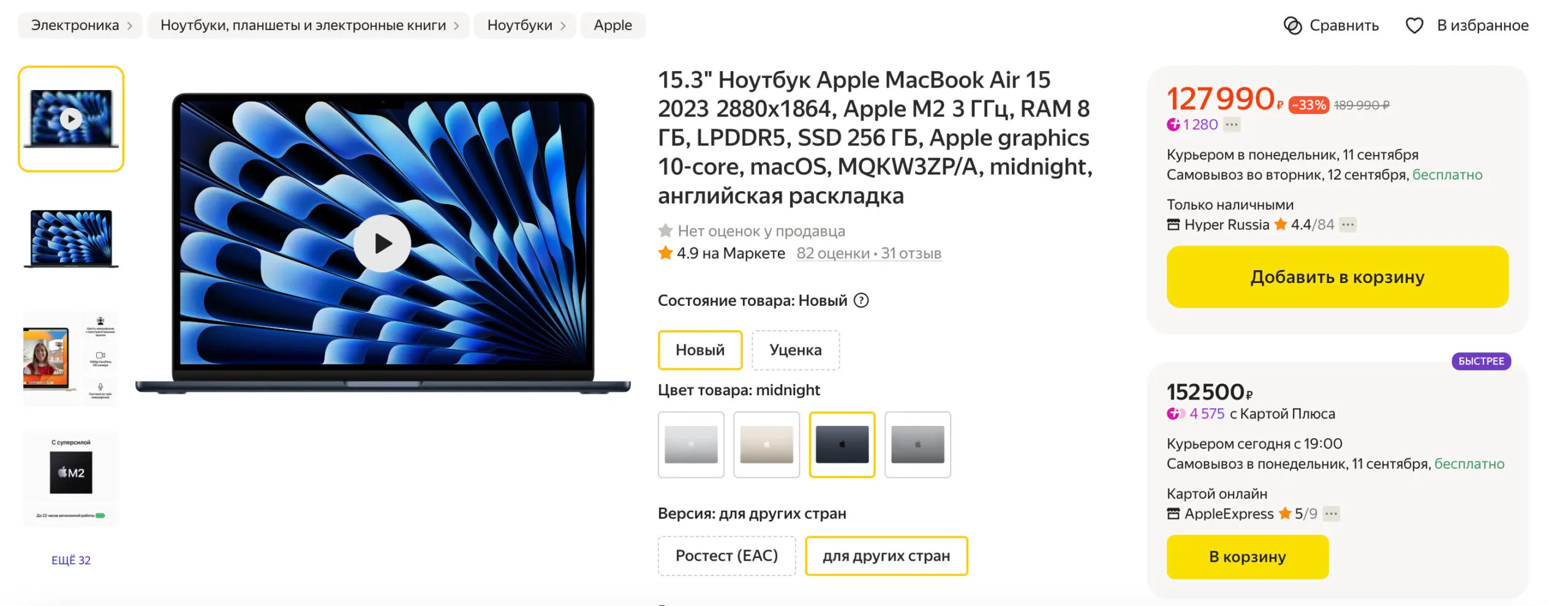 Смотрите сами: 1359 евро — 143 тысячи рублей по текущему курсу. Открываем Маркет и видим, что стартовый MacBook Air 15 стоит 127 990 рублей.