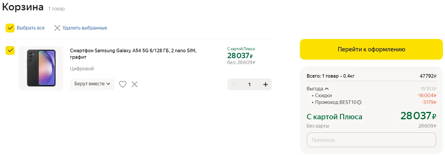 Если вам плевать на эти нюансы, смело хватайте Galaxy A54. Вот гайд по получению лучшего прайса: переходите по этой ссылочке, добавляйте в корзину лот от продавца «Цифровой» и оформляйте заказ с промокодом BEST10. При оплате через фирменный сервис «Пэй» цена составит всего 28 040 рублей, а при использовании обычной карты — 28 610 рублей. Что такое «Пэй»? Объясняли в отдельной заметке — обязательно прочитайте.