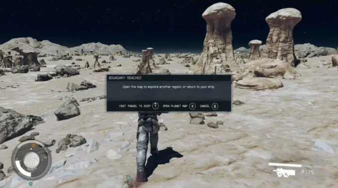 Как это работает? На играбельной планете вы выбираете зону, которую хотите исследовать. Спускаетесь. Идете в любую сторону несколько миль. А потом видите перед собой сообщение «ВЫ НЕ МОЖЕТЕ ИДТИ СЮДА». Никаких больше объяснений. Играть можно только там, где Bethesda положила контент, а где не положила, нельзя даже гулять. Круто!