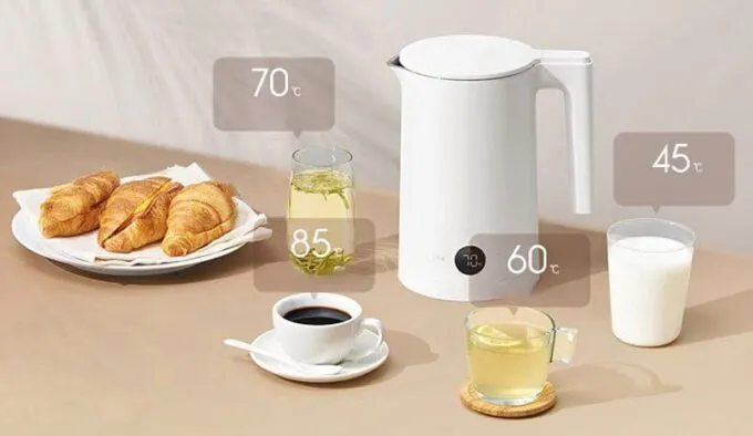 Xiaomi Mijia Thermostatic Electric Kettle 2 — футуристичный гаджет с приятным корпусом белого цвета и круглым дисплеем. На экран выводится информация о температуре жидкости. За относительно небольшой прайс он предлагает функции стандартного чайника и термопота. То есть можно задать определённую температуру, которую он будет поддерживать на протяжении всего дня. На выбор доступны четыре степени подогрева — 45°С / 60°С / 70°С / 85°С.