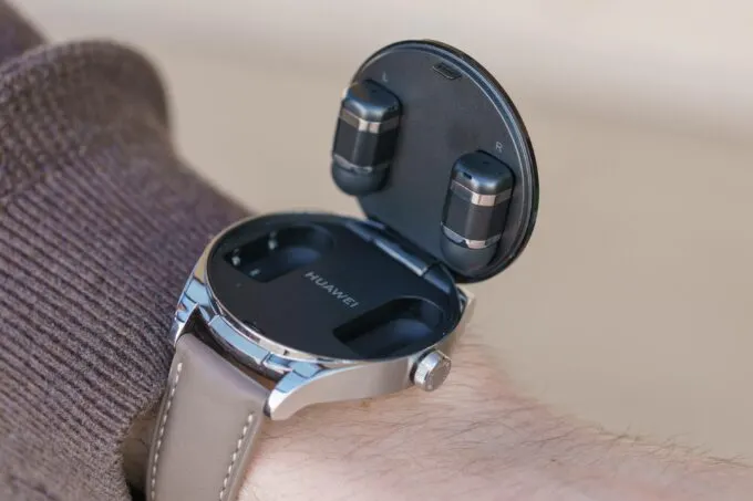 Внешне Huawei Watch Buds выглядят как классические смарт-часы бренда с корпусом из стали и кожаным ремешком. Девайс предлагает довольно крупный 1,43-дюймовый AMOLED-дисплей с разрешением 466×466 пикселей. Справа расположено колёсико, а под циферблатом — кнопка поднятия экрана.