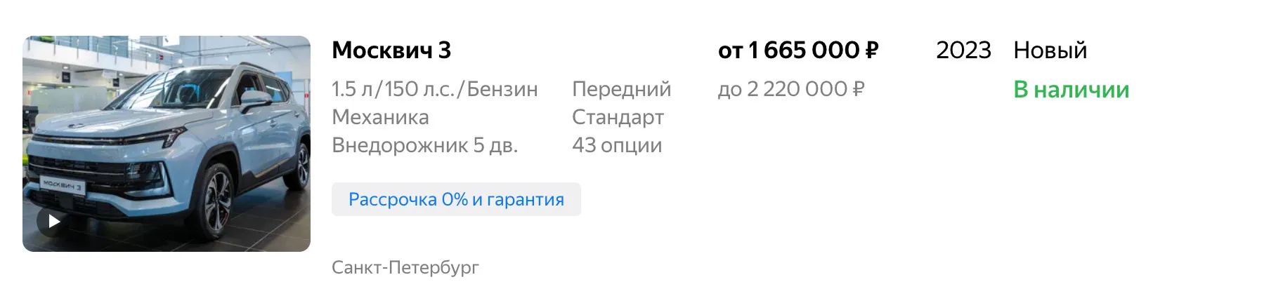 Непонятно, за что такая переплата. В том же «Рольфе» «Москвич 3» в базе стоит 1,6 млн рублей. Самый доступный электрокар «Москвич 3е» можно купить за 3,2 млн рублей. JAC JS4, с которого слизаны «москвичи», стоит в России минимум 1,8 млн рублей.