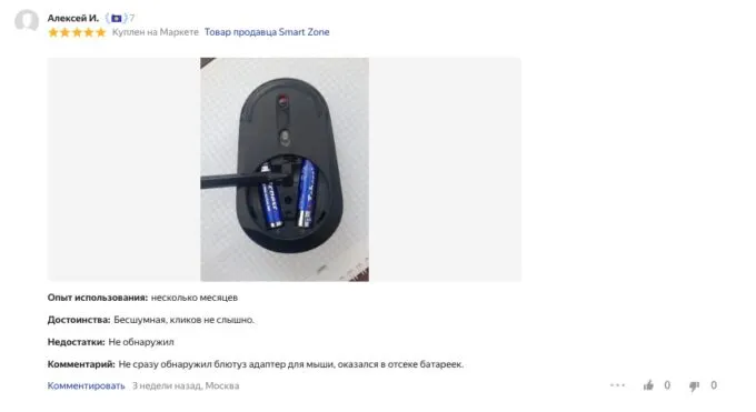 Сконнектить мышь можно только через USB-радиоприёмник, который прячется в корпус. Возможно, для кого-то станет минусом отсутствие Bluetooth. Ещё один плюс — питание от обычных ААА-батареек. От двух таких батарей мышь проживёт полгода.