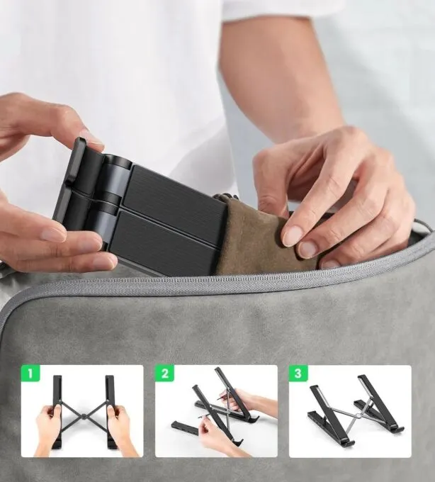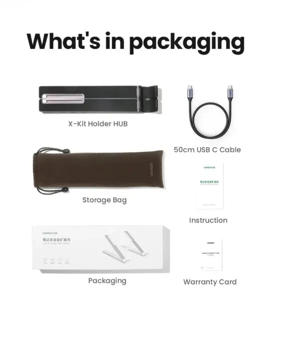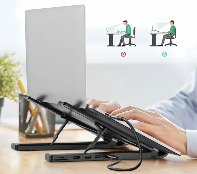 Ugreen X-Kit Holder Hub — складная подставка с возможностью регулировки высоты ноутбука и встроенным хабом на 5 самых необходимых портов. Этот девайс не только многофункционален, но и полезен для здоровья, поскольку вы ноут будет расположен на комфортной для глаз высоте. Так вы снизите нагрузку на шею и плечи.