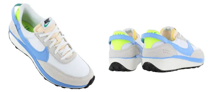 Теперь к моделям. Первый айтем – светлые Nike Waffle Debut. Эта повседневная обувь отсылает модников к 1970-м. Но ретро-дизайн сочетается с современными технологиями, которые всегда были частью американского бренда. Тут и обновленная межподошва, отвечающая за комфорт и амортизацию, и вафельная подошва, которая обеспечивает идеальное сцепление с дорогой.