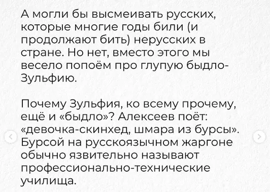 «Скинхедка-Зульфия – практически несуществующий образ, который, вместо проблематизации скинов как таковых, высмеивает нерусских, бьющих нерусских», – отметили в публикации Asians of Russia. Авторы поста, видимо, не знали, что песня появилась на релизе, вышедшем еще в далеком 2008 году.