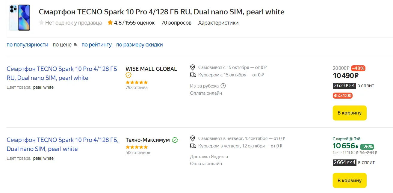 Удивительно, но недостатков нет — «прошка» не уступает альтернативам по спецификациям. И стоит всего 10,5 кэсов — это действительно невысокая цена. Однако есть нюанс: по такому прайсу доступен лот с доставкой из-за рубежа, которая займет как минимум неделю. Хотите лот с быстрой курьерской доставкой? Он обойдется минимум в 11 100 рублей — переплата небольшая, можно и докинуть. А при оплате через фирменный сервис «Пэй» Маркет сделает скидку, и смарт достанется вам за 10 660 рублей.