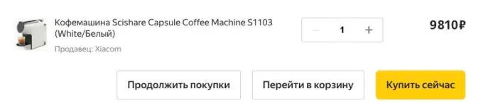 Сейчас на Яндекс Маркете кофемашину Xiaomi Scishare Smart Capsule Coffee Machine S1103 можно купить за 9810 рублей и кэшбекнуть почти косарь при оплате картами некоторых банков.