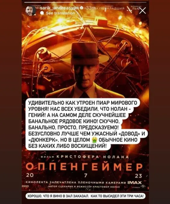 Постановщик «Чикатило», «Жизни по вызову» и адских комедий из 2010-х вынес «Оппенгеймеру» неутешительный вердикт. По мнению Сарика, Кристофер Нолан снял скучнейшее, банальное и рядовое кино. Об этом Андреасян написал в запрещенной соцсети.