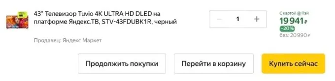 Сейчас на Яндекс Маркете народный телевизор Tuvio 4K Ultra HD DLED можно купить за 20 990 рублей. Для максимальной выгоды нужно оплатить покупку банком, который предлагает больший кэшбек. Так он обойдётся в 19 косарей.