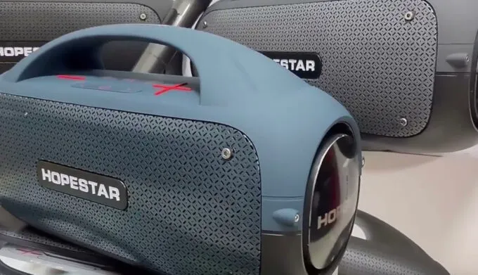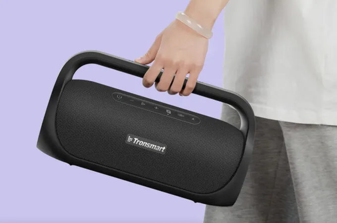 Колонка с «выпуклым» дизайном и ручкой для переноски. Совокупная мощность составляет аж 80 Вт, мощность «саба» отдельно — 50 Вт. Можно подключаться по Bluetooth или вставить флешку. На одном заряде протянет 8 часов, есть возможность использовать колонку в качестве пауэрбанка. В комплекте есть беспроводной микрофон и функция караоке (вау).
