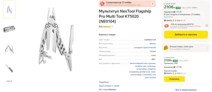 Обычно такие инструменты стоят под 5 косарей, но сейчас на Яндекс Маркете флагманский мультитул Xiaomi NexTool Flagship Pro можно забрать за 1914 рублей по промокоду BEST10, а с кэшбеком некоторых банков он обойдётся ещё дешевле.