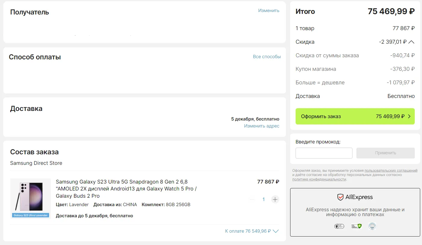 75,5 тысяч — роскошный прайс для такого флагмана. Рассказываем, как забрать смартфон по этой цене. Нужно лишь перейти по этой ссылочке, забрать купон продавца, выбрать лот в кремовом, зеленом или лавандовом цвете и оформить заказ — в корзине активируется дополнительная скидка. Не забудьте применить промокод PALACH перед оформлением заказа. При использовании промика AliExpress начислит вам 300 подарочных баллов на следующие покупки. Дублируем волшебный линк для вашего удобства.