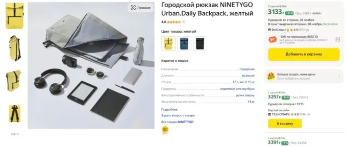 Обычно за NinetyGo Urban Daily Backpack просят под 5 косарей, но сейчас на Яндекс Маркете этот рюкзак можно забрать всего за 2850 рублей по промокоду BEST10. Также не забывайте, что многие банки готовы отсыпать щедрый кэшбек за покупку на этой платформе.