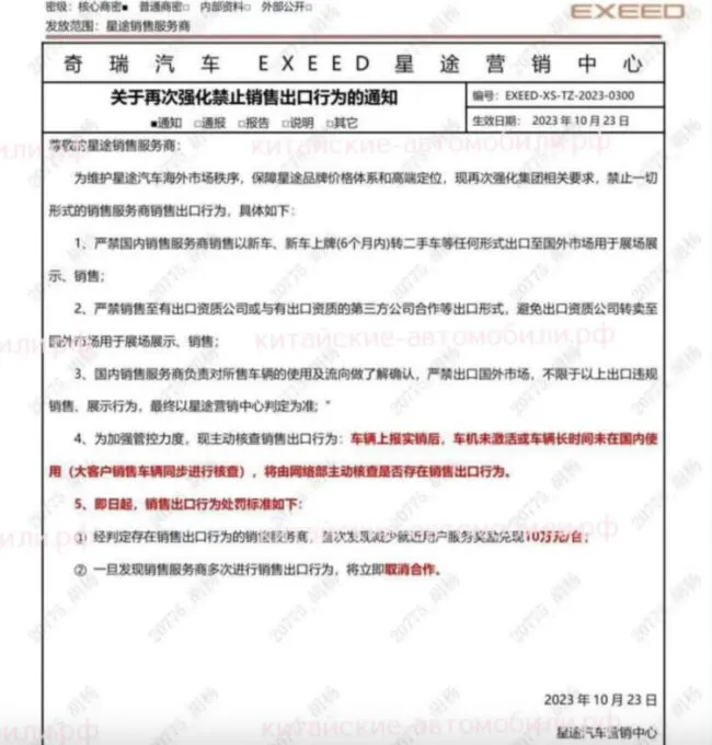Журналисты получили в свое распоряжение внутренний документ, который топы Chery разослали своим партнерам. Бумага касается только Exeed, но фирма уже выпустила такой же документ для Chery и Jetour. Корпорация заявила, что намерена усилить свои позиции на внешних рынках путем официального импорта, а поэтому запрещает все серые схемы.