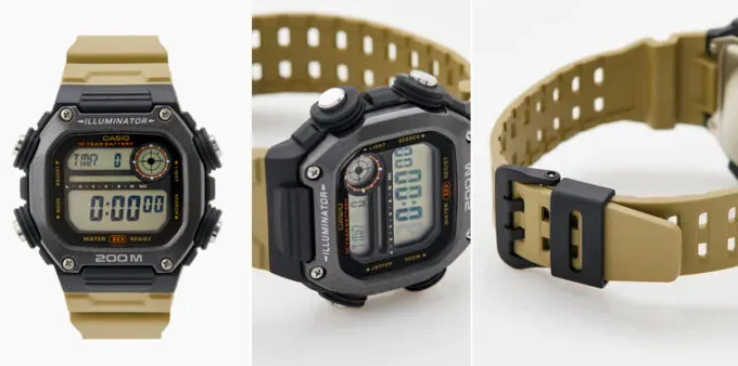 У этих часов восьмиугольный безель, который держится на винтах, прочный пластиковый корпус, металлические кнопки и ремешок с классической застежкой. ЖК-дисплей может отображать время и дату, циферблат немного утоплен, чтобы его было сложнее повредить.