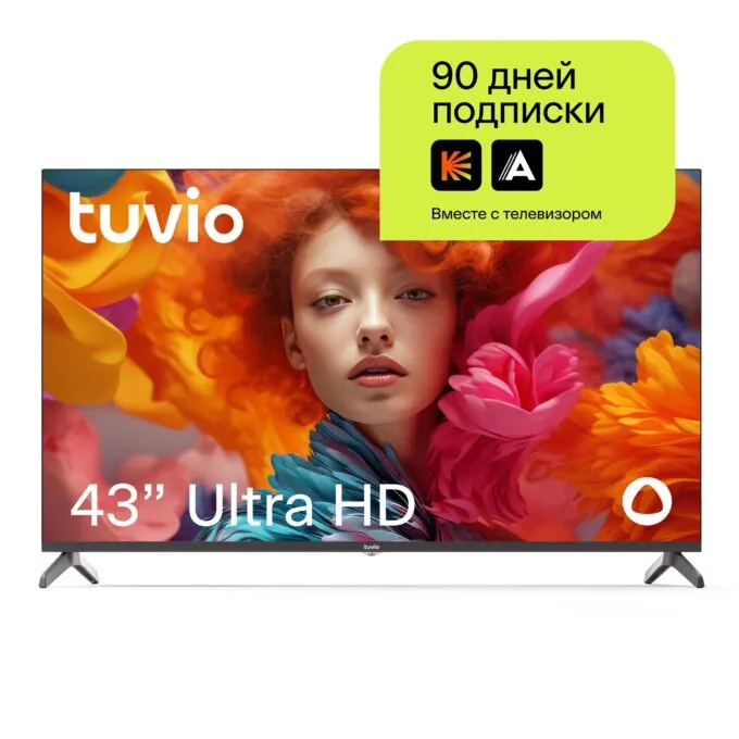Tuvio 4K Ultra HD DLED (TD43UFGCV1) — одна из свежих моделей Яндекса с ультратонкими рамками и замечательной картинкой. «Ящик» предлагает 43-дюймовый ЖК-дисплей (IPS-матрица) с разрешением 4K UHD (3840х2160 пикселей), стандартной частотой обновления 60 Гц и подсветкой Direct LED. Заявленной яркости в 260 нит вполне достаточно для комфортного просмотра фильмов и сериалов. Главное — не ставить телик напротив окна, иначе днём будете ловить блики.