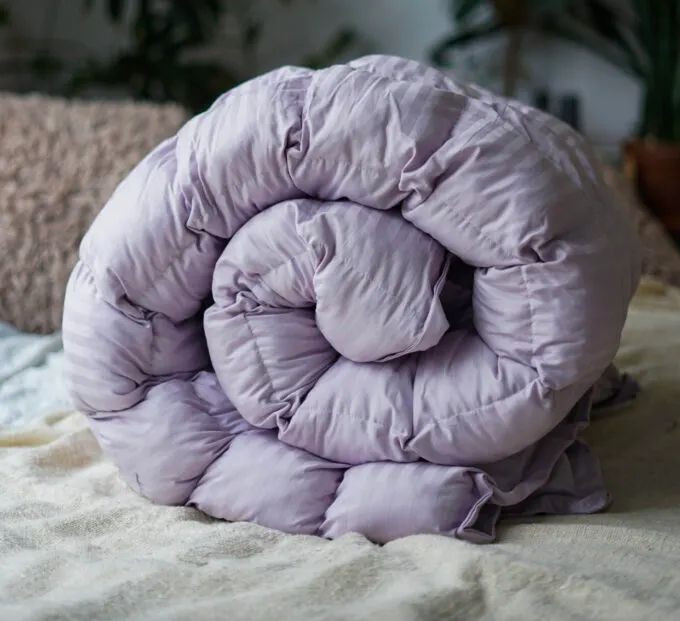 Идеальное одеяло на зиму. Можно выбрать один из нескольких вариантов — есть даже одеяла для детей и большие модели весом до 14 кг. В качестве утеплителя используется холлофайбер, внутри находятся стеклянные гранулы. Толщина настолько большая, что гранулы вообще не прощупываются. В комплекте есть сумка для хранения.