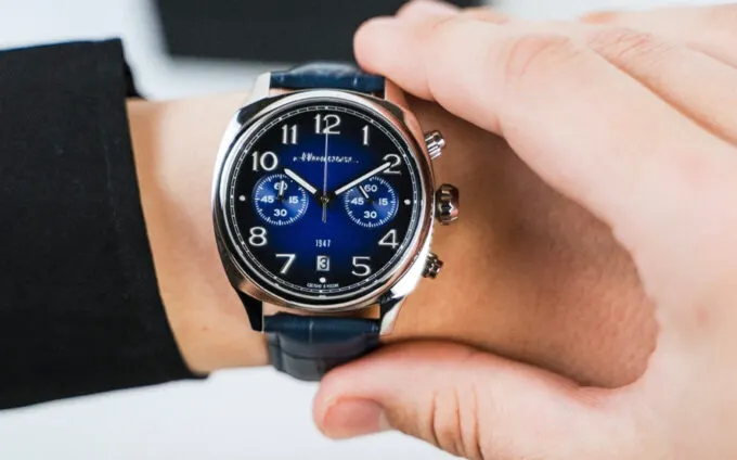 Максимально консервативные и простые часы — таких в наше время почти не делают. У них стальной корпус, сапфировое стекло, японский кварцевый механизм-хронограф от Miyota. Универсальная модель, которая все же будет идеально смотреться с деловым костюмом.