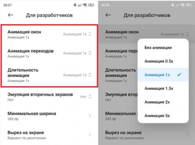 Эта настройка будет полезна владельцам слабых смартфонов. По умолчанию во всех трех параметрах (анимация окон, переходов и длительность анимации) стоит показатель 1, но можно изменить его на 0,5. В этом случае сократится время отклика, но процессор и память будут нагружаться меньше.