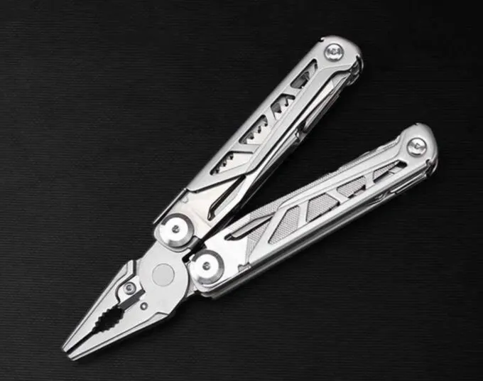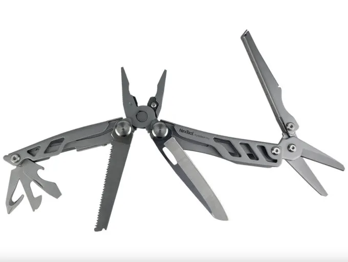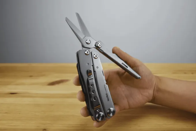 Еще один недорогой, но навороченный мультитул. Тут есть открывашка, консервный нож, стропорез, пассатижи и даже почти полноразмерные ножницы. Штука очень прочная, она изготовлена из стали 5cr15mov, которая имеет высокое содержание углерода.