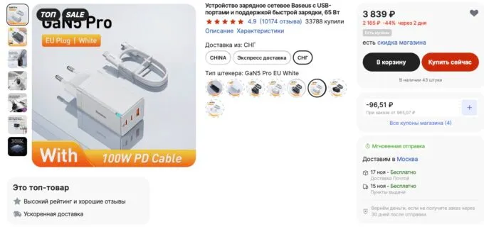 Сейчас на AliExpress можно закинуть крутейшую зарядку Baseus GaN5 Pro на 65 Вт в корзину, а через два дня оплатить за неё всего 2165 рублей. Ну, а если вы не хотите ждать, то можете урвать на Яндекс Маркете эту же модель с быстрой доставкой за 2670 рублей.