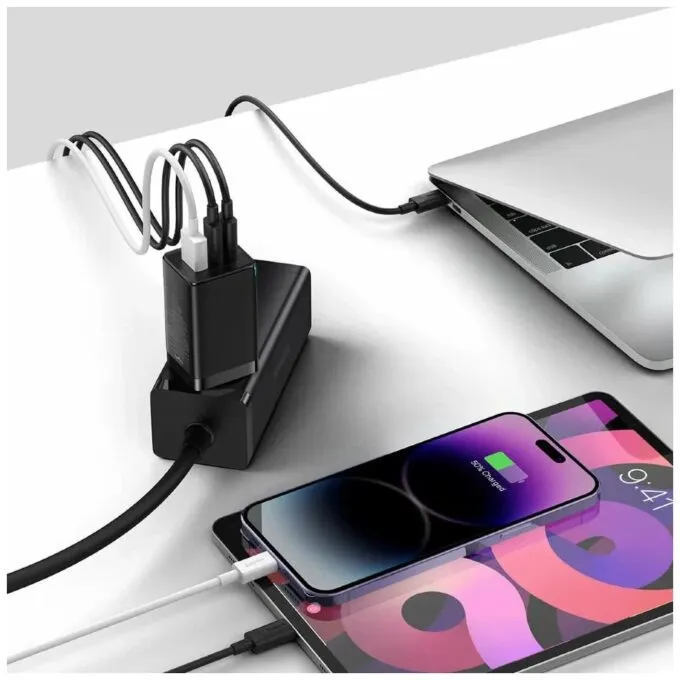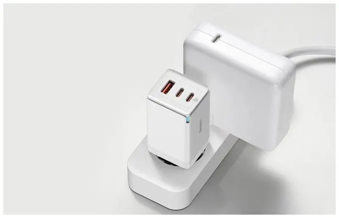 По спекам у Baseus GaN5 Pro всё отлично: общая выходная мощность в 65 Вт делится между заряжаемыми девайсами. Если сразу подрубить несколько, то первый порт USB-C получит 45 Вт, второй —10 Вт, а USB-A — 5 Вт. Идеальное комбо для зарядки смартфона, смарт-часов и наушников.