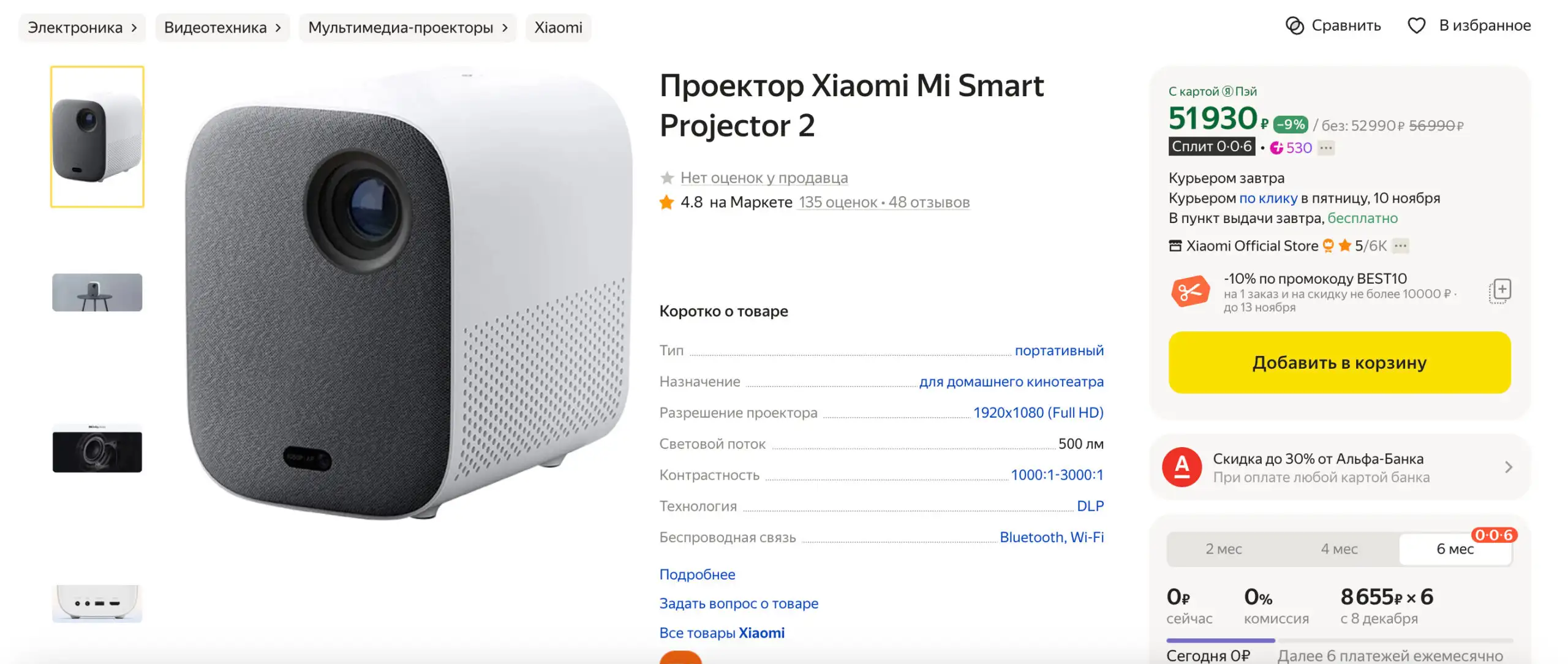 Например, вот старшая версия модели — Xiaomi Mi Smart Projector 2 отдают за 51 930 рублей. Но с промокодом BEST10 получится на 10% дешевле.