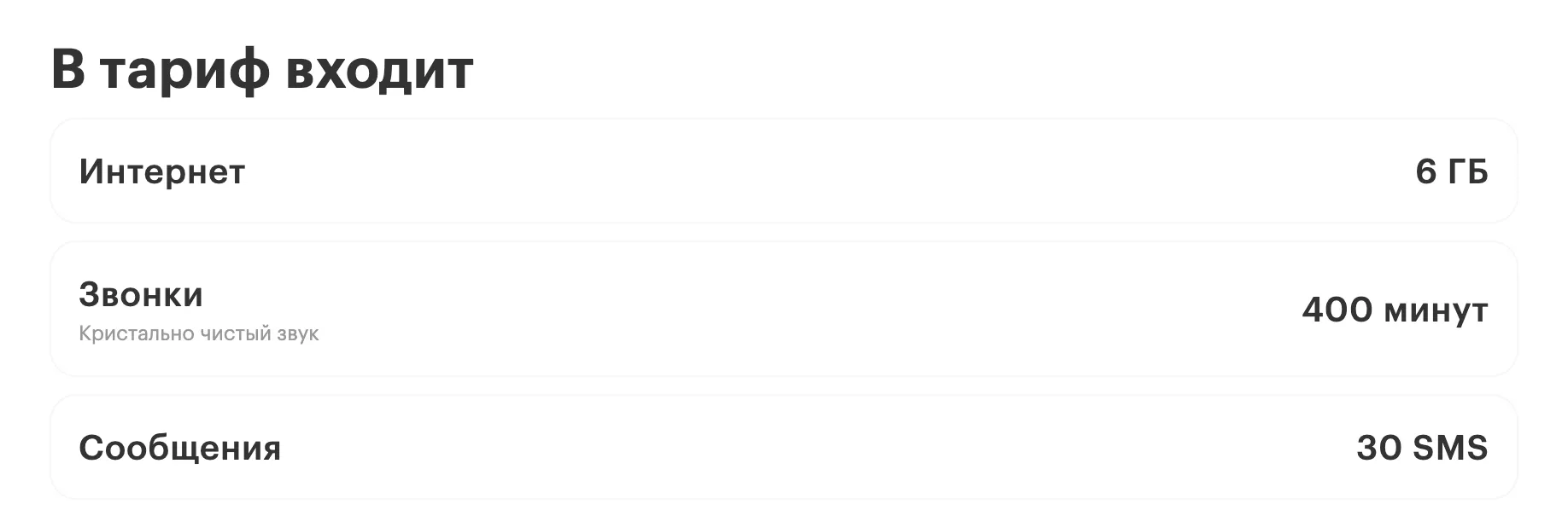 Ну и тариф «Минимум» — далеко не самый щедрый. В него входят 6 Гбайт интернета и 400 минут звонков (предложение для Москвы, 5 Гбайт и 300 минут соответственно в СПб и других городах), 30 SMS.